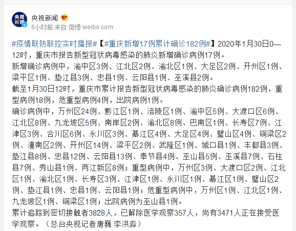 2020年1月30日0—12时,重庆市报告新型冠状病毒感染的肺炎新增确诊病例17例。