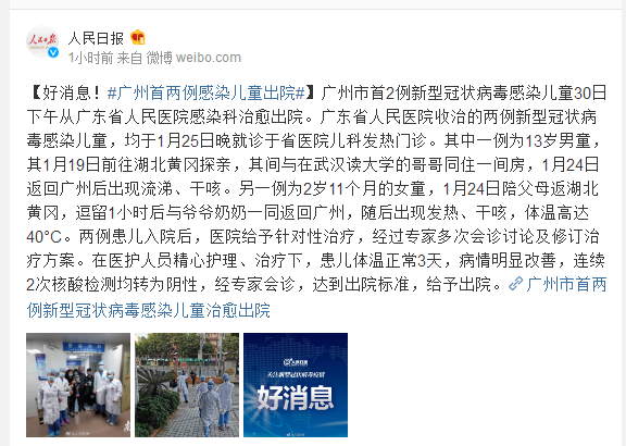 广州市首2例新型冠状病毒感染儿童30日下午从广东省人民医院感染科治愈出院。广东省人民医院收治的两例新型冠状病毒感染儿童,均于1月25日晚就诊于省医院儿科发热门诊。其中一例为13岁男童,其1月19日前往湖北黄冈探亲,其间与在武汉读大学的哥哥同住一间房,1月24日返回广州后出现流涕、干咳。另一例为2岁11个月的女童,1月24日陪父母返湖北黄冈,逗留1小时后与爷爷奶奶一同返回广州,随后出现发热、干咳,体温高达40°C。两例患儿入院后,医院给予针对性治疗,经过专家多次会诊讨论及修订治疗方案。在医护人员精心护理、治疗下,患儿体温正常3天,病情明显改善,连续2次核酸检测均转为阴性,经专家会诊,达到出院标准,给予出院。