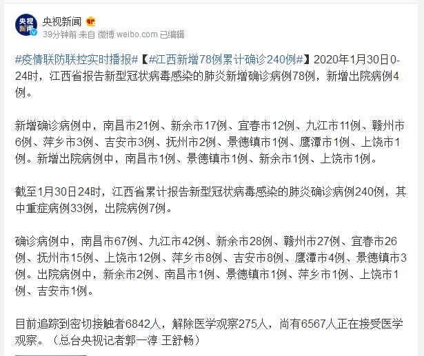 截至1月30日24时,江西省累计报告新型冠状病毒感染的肺炎确诊病例240例,其中重症病例33例,出院病例7例。
