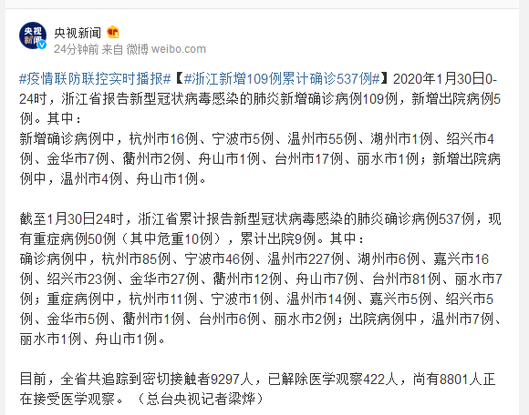 截至1月30日24时,浙江省累计报告新型冠状病毒感染的肺炎确诊病例537例,现有重症病例50例(其中危重10例),累计出院9例。其中: