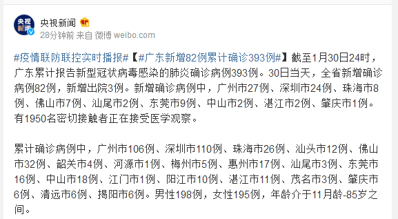 截至1月30日24时,广东累计报告新型冠状病毒感染的肺炎确诊病例393例。30日当天,全省新增确诊病例82例,新增出院3例。新增确诊病例中,广州市27例、深圳市24例、珠海市8例、佛山市7例、汕尾市2例、东莞市9例、中山市2例、湛江市2例、肇庆市1例。有1950名密切接触者正在接受医学观察。