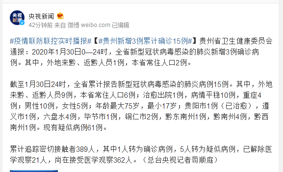 截至1月30日24时,全省累计报告新型冠状病毒感染的肺炎病例15例。其中,外地来黔、返黔人员9例,本省常住人口6例;治愈出院1例,病情平稳10例,重症4例;男性10例,女性5例;年龄最大75岁,最小17岁;贵阳市1例(已治愈),遵义市1例,六盘水4例,毕节市1例,铜仁市2例,黔东南州1例,黔南州4例,黔西南州1例。现有疑似病例61例。