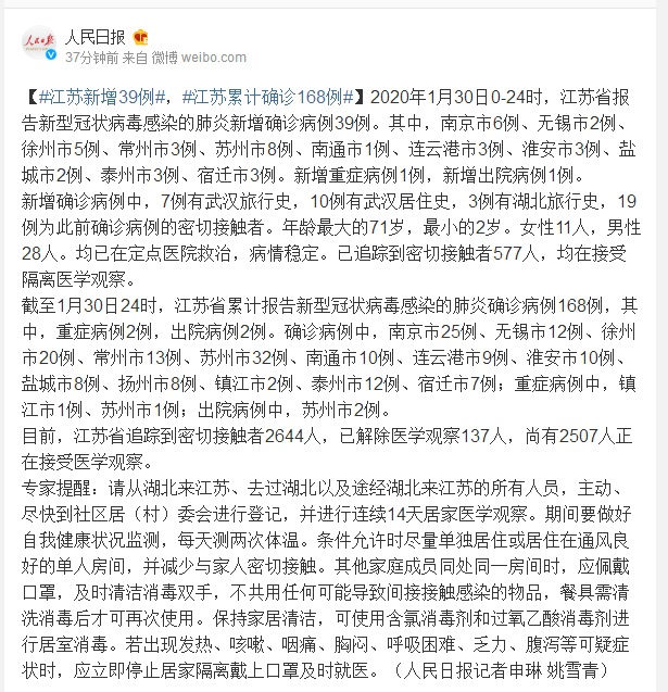 截至1月30日24时,江苏省累计报告新型冠状病毒感染的肺炎确诊病例168例,其中,重症病例2例,出院病例2例。确诊病例中,南京市25例、无锡市12例、徐州市20例、常州市13例、苏州市32例、南通市10例、连云港市9例、淮安市10例、盐城市8例、扬州市8例、镇江市2例、泰州市12例、宿迁市7例;重症病例中,镇江市1例、苏州市1例;出院病例中,苏州市2例。