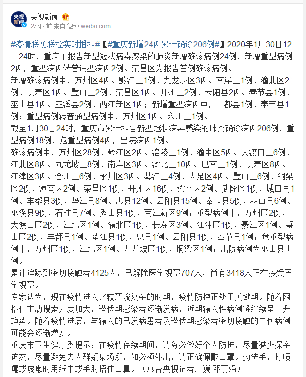 截至1月30日24时,重庆市累计报告新型冠状病毒感染的肺炎确诊病例206例,重型病例18例,危重型病例4例,出院病例1例。