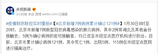 1月30日8时至20时,北京市新增7例新型冠状病毒感染的肺炎病例,其中2例有湖北及其他省份接触史,5例为确诊病例的密切接触者,均已送至市级定点医疗机构进行救治。目前,北京市累计确诊病例121例,其中死亡1例,出院5例,115例在市级定点医院进行隔离治疗。