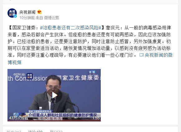 詹庆元:从一般的病毒感染规律来看,感染后都会产生抗体。但痊愈的患者还是有可能再感染,因此应该加强防护。已经治愈的患者,还是要注意防护,同时注意防止感冒,另外加强康复。初期可以在家里做适当活动,随恢复情况增加活动量,以感到没有疲劳感为活动标准,同时还要注重心理疏导,有必要建议他们看一些心理门诊。