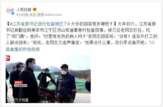 大年初六,江苏省委书记娄勤俭到南京市江宁区汤山街道葛巷村检查疫情,被几位老同志拦住,吃了“闭门羹”。他问:“村里有发热的病人吗?”老同志回答说:“没有!连在外打工的人都没回来。”说完,老同志又连声催促:“如果没什么事,你们早点离开吧。”