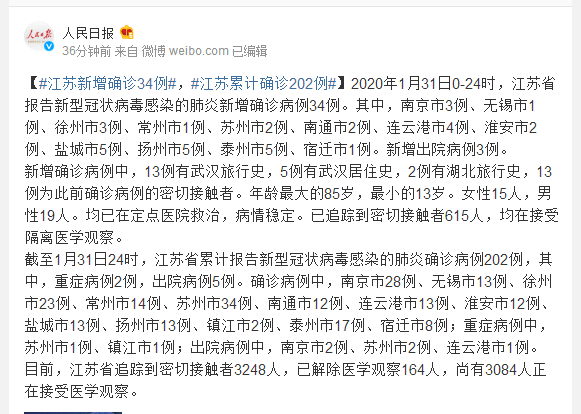 截至1月31日24时,江苏省累计报告新型冠状病毒感染的肺炎确诊病例202例,其中,重症病例2例,出院病例5例。确诊病例中,南京市28例、无锡市13例、徐州市23例、常州市14例、苏州市34例、南通市12例、连云港市13例、淮安市12例、盐城市13例、扬州市13例、镇江市2例、泰州市17例、宿迁市8例;重症病例中,苏州市1例、镇江市1例;出院病例中,南京市2例、苏州市2例、连云港市1例。