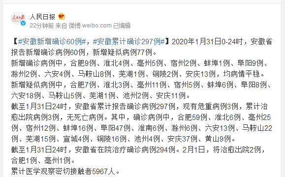 2020年1月31日0-24时,安徽省报告新增确诊病例60例,新增疑似病例77例。