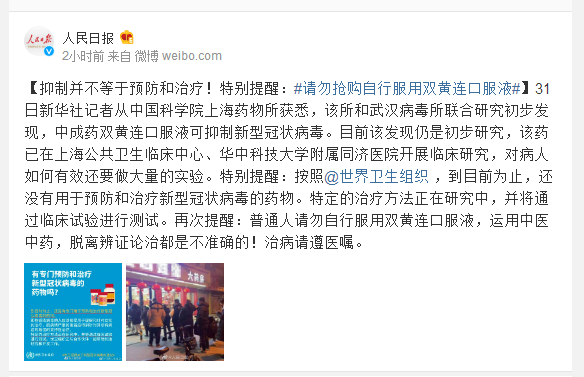 31日新华社记者从中国科学院上海药物所获悉,该所和武汉病毒所联合研究初步发现,中成药双黄连口服液可抑制新型冠状病毒。目前该发现仍是初步研究,该药已在上海公共卫生临床中心、华中科技大学附属同济医院开展临床研究,对病人如何有效还要做大量的实验。特别提醒:按照@世界卫生组织 ,到目前为止,还没有用于预防和治疗新型冠状病毒的药物。特定的治疗方法正在研究中,并将通过临床试验进行测试。再次提醒:普通人请勿自行服用双黄连口服液,运用中医中药,脱离辨证论治都是不准确的!治病请遵医嘱。