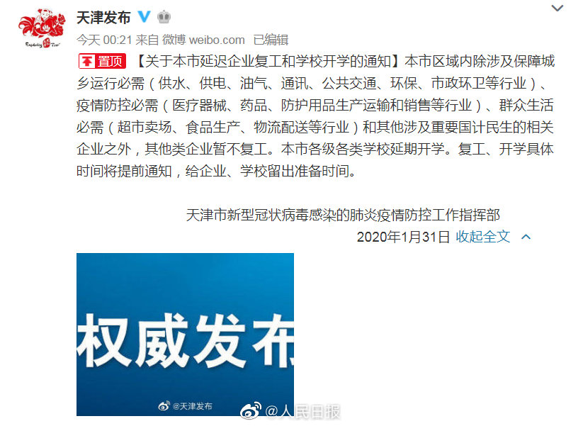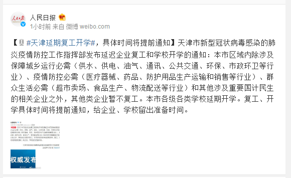 天津市新型冠状病毒感染的肺炎疫情防控工作指挥部发布延迟企业复工和学校开学的通知:本市区域内除涉及保障城乡运行必需(供水、供电、油气、通讯、公共交通、环保、市政环卫等行业)、疫情防控必需(医疗器械、药品、防护用品生产运输和销售等行业)、群众生活必需(超市卖场、食品生产、物流配送等行业)和其他涉及重要国计民生的相关企业之外,其他类企业暂不复工。本市各级各类学校延期开学。复工、开学具体时间将提前通知,给企业、学校留出准备时间。