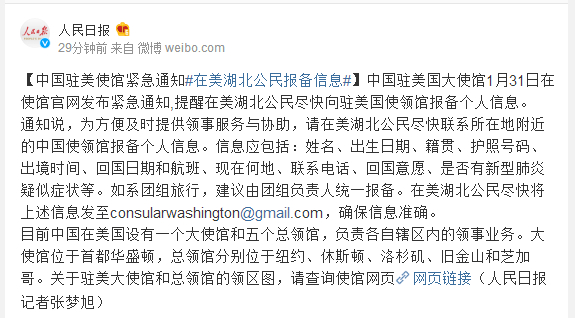 通知说,为方便及时提供领事服务与协助,请在美湖北公民尽快联系所在地附近的中国使领馆报备个人信息。信息应包括:姓名、出生日期、籍贯、护照号码、出境时间、回国日期和航班、现在何地、联系电话、回国意愿、是否有新型肺炎疑似症状等。如系团组旅行,建议由团组负责人统一报备。在美湖北公民尽快将上述信息发至consularwashington@gmail.com,确保信息准确。