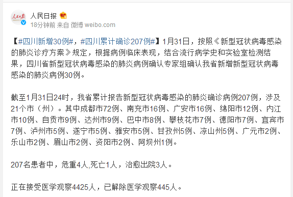 1月31日,按照《新型冠状病毒感染的肺炎诊疗方案》规定,根据病例临床表现,结合流行病学史和实验室检测结果,四川省新型冠状病毒感染的肺炎病例确认专家组确认我省新增新型冠状病毒感染的肺炎病例30例。