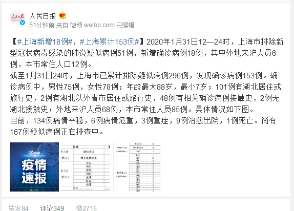 2020年1月31日12—24时,上海市排除新型冠状病毒感染的肺炎疑似病例51例,新增确诊病例18例,其中外地来沪人员6例,本市常住人口12例。