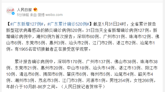 截至1月31日24时,全省累计报告新型冠状病毒感染的肺炎确诊病例520例。31日当天全省新增确诊病例127例。新增确诊病例中,潮州3例为首次报告;深圳市60例、广州市31例、珠海市12例、佛山市6例、东莞市5例、惠州3例、汕头市2例、江门市2例、湛江市2例、汕尾市1例。有1965名密切接触者正在接受医学观察。