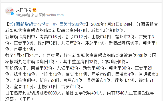 截至1月31日24时,江西省累计报告新型冠状病毒感染的肺炎确诊病例286例(国家核减九江市确诊病例1例),其中重症病例33例,出院病例9例。