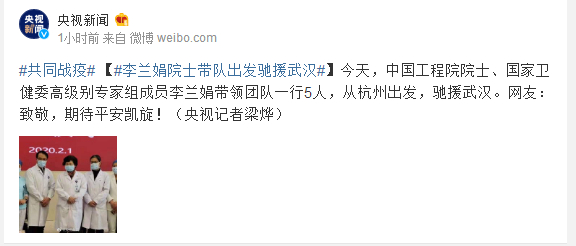今天,中国工程院院士、国家卫健委高级别专家组成员李兰娟带领团队一行5人,从杭州出发,驰援武汉。网友:致敬,期待平安凯旋!(央视记者梁烨)