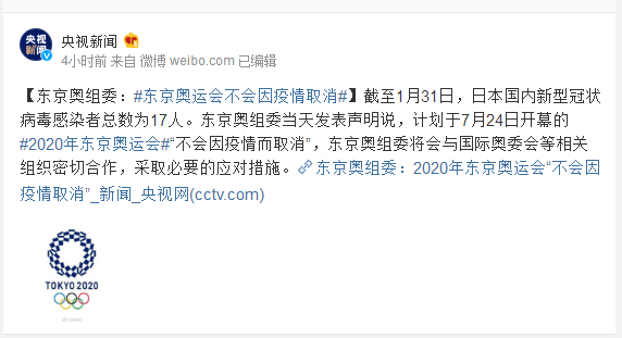 截至1月31日,日本国内新型冠状病毒感染者总数为17人。东京奥组委当天发表声明说,计划于7月24日开幕的#2020年东京奥运会#“不会因疫情而取消”,东京奥组委将会与国际奥委会等相关组织密切合作,采取必要的应对措施。