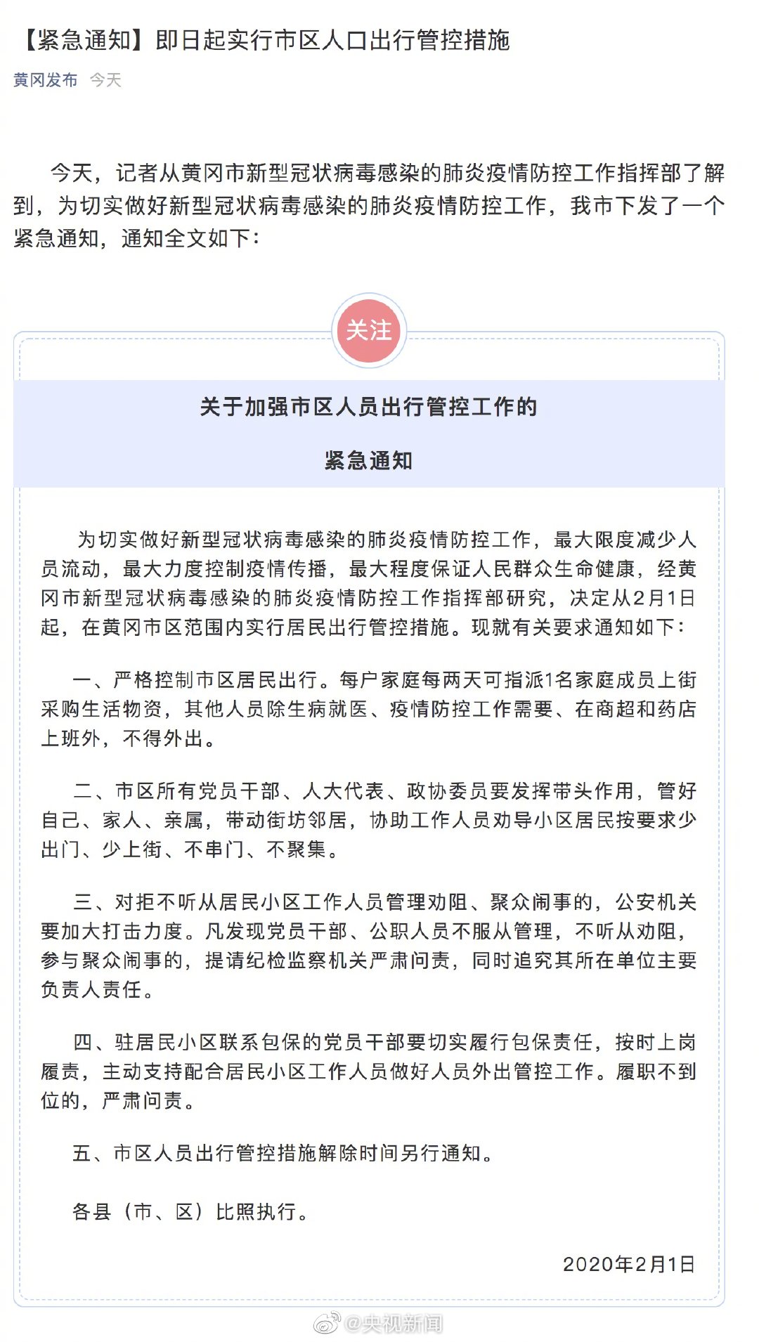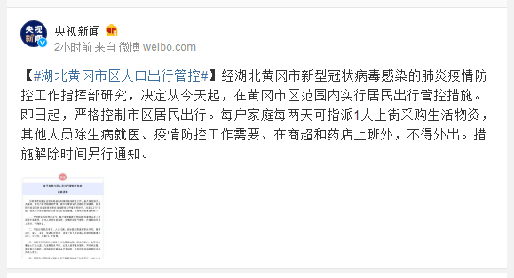 经湖北黄冈市新型冠状病毒感染的肺炎疫情防控工作指挥部研究,决定从今天起,在黄冈市区范围内实行居民出行管控措施。即日起,严格控制市区居民出行。每户家庭每两天可指派1人上街采购生活物资,其他人员除生病就医、疫情防控工作需要、在商超和药店上班外,不得外出。措施解除时间另行通知。