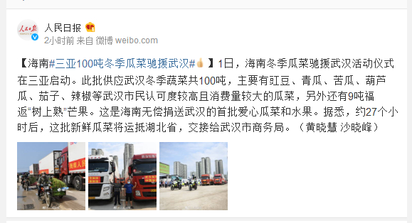 2月1日,海南冬季瓜菜驰援武汉活动仪式在三亚启动。此批供应武汉冬季蔬菜共100吨,主要有豇豆、青瓜、苦瓜、葫芦瓜、茄子、辣椒等武汉市民认可度较高且消费量较大的瓜菜,另外还有9吨福返“树上熟”芒果。这是海南无偿捐送武汉的首批爱心瓜菜和水果。据悉,约27个小时后,这批新鲜瓜菜将运抵湖北省,交接给武汉市商务局。(黄晓慧 沙晓峰)