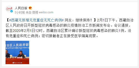 2月1日下午,西藏自治区人民政府召开新型冠状病毒感染的肺炎疫情防治工作新闻发布会。会议通报,截至2020年2月1日12时,西藏自治区累计确诊新型冠状病毒感染的肺炎1例,没有危重症和死亡病例;密切接触者正在接受医学隔离观察。