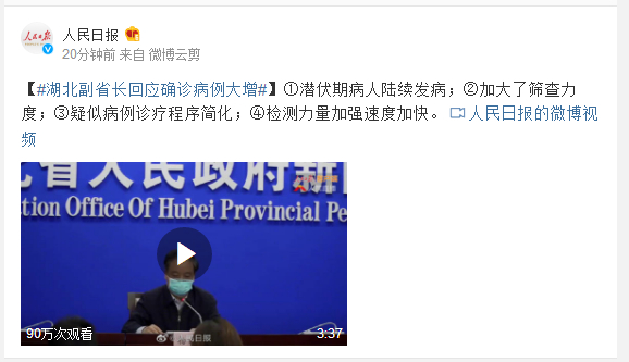 湖北副省长回应新冠状病毒感染的肺炎确诊病例大增原因: ①潜伏期病人陆续发病;②加大了筛查力度;③疑似病例诊疗程序简化;④检测力量加强速度加快。
