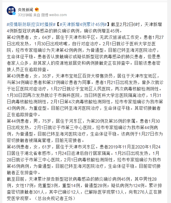 第43例患者,女,35岁,天津市宝坻区百货大楼售货员,居住于天津市宝坻区,与第34例确诊患者和第37例确诊患者为同事。患者1月21日出现发热,曾多次就诊于社区医院对症治疗,1月27日就诊于宝坻区人民医院,两次病毒核酸检测阴性。1月30日因再次发热就诊于市胸科医院,当日转医科大学总医院隔离治疗,1月31日病毒核酸检测阴性,2月1日第4次病毒核酸检测阳性,经市专家组确诊为我市第43例病例,为重症型。目前已转至海河医院治疗,生命体征平稳。其密切接触者正在追踪排查中。