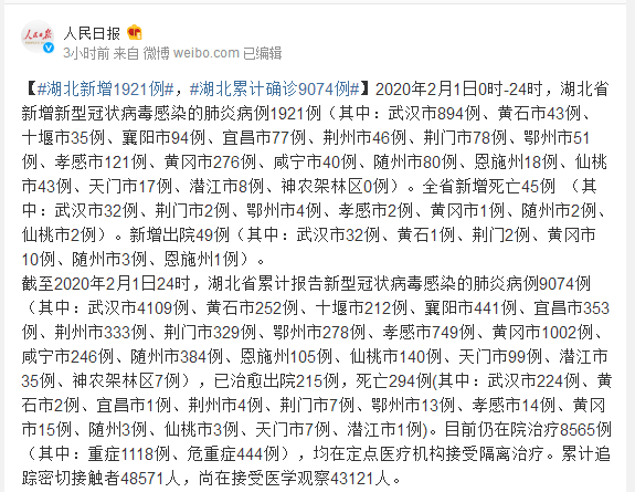 2020年2月1日0时-24时,湖北省新增新型冠状病毒感染的肺炎病例1921例(其中:武汉市894例、黄石市43例、十堰市35例、襄阳市94例、宜昌市77例、荆州市46例、荆门市78例、鄂州市51例、孝感市121例、黄冈市276例、咸宁市40例、随州市80例、恩施州18例、仙桃市43例、天门市17例、潜江市8例、神农架林区0例)。全省新增死亡45例 (其中:武汉市32例、荆门市2例、鄂州市4例、孝感市2例、黄冈市1例、随州市2例、仙桃市2例)。新增出院49例(其中:武汉市32例、黄石1例、荆门2例、黄冈市10例、随州市3例、恩施州1例)。