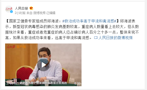 邱海波表示,新型冠状病毒感染的肺炎发病基数较高,重症病人数量看上去较大,但从数据统计来看,重症或者危重症的病人应占确诊病人百分之十多一点,整体来说不高,如果从救治成功率来看,远高于甲流和禽流感。
