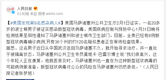 美国马萨诸塞州公共卫生厅2月1日证实,一名20多岁的波士顿男子被证实感染新型冠状病毒,美国疾病控制与预防中心1月31日晚将检测结果呈阳性通知了马萨诸塞州和波士顿市卫生部门。目前,全美已经有8例新型冠状病毒确诊病例,另有36个州的约120名疑似患者正在等待检查结果。