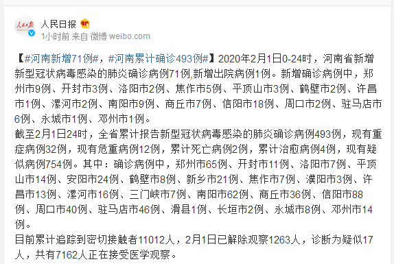 截至2月1日24时,全省累计报告新型冠状病毒感染的肺炎确诊病例493例,现有重症病例32例,现有危重病例12例,累计死亡病例2例,累计治愈病例4例,现有疑似病例754例。其中:确诊病例中,郑州市65例、开封市11例、洛阳市7例、平顶山市14例、安阳市24例、鹤壁市8例、新乡市21例、焦作市7例、濮阳市3例、许昌市13例、漯河市16例、三门峡市7例、南阳市62例、商丘市36例、信阳市88例、周口市40例、驻马店市46例、滑县1例、长垣市2例、永城市8例、邓州市14例。
