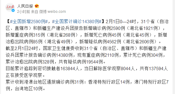 截至2月1日24时,国家卫生健康委收到31个省(自治区、直辖市)和新疆生产建设兵团累计报告确诊病例14380例,现有重症病例2110例,累计死亡病例304例,累计治愈出院病例328例,共有疑似病例19544例。
