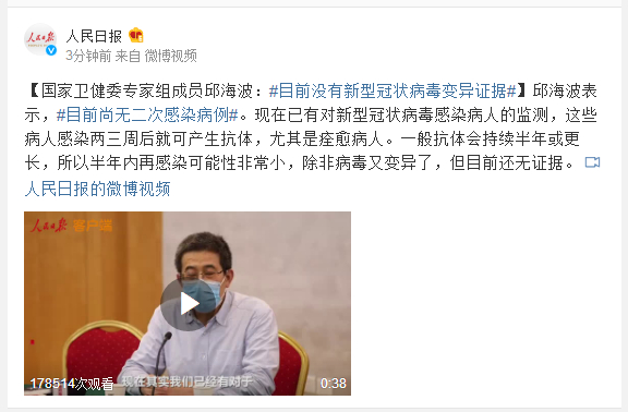 邱海波表示,#目前尚无二次感染病例#。现在已有对新型冠状病毒感染病人的监测,这些病人感染两三周后就可产生抗体,尤其是痊愈病人。一般抗体会持续半年或更长,所以半年内再感染可能性非常小,除非病毒又变异了,但目前还无证据。