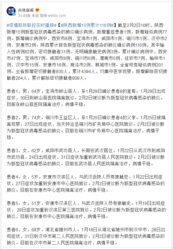 截至2月2日10时,陕西新增15例新型冠状病毒感染的肺炎确诊病例,新增重症患者1例,新增疑似病例77例。新增确诊病例中,西安市8例、宝鸡市1例、咸阳市1例、铜川市1例、汉中市2例、安康市2例。陕西累计报告新型冠状病毒感染的肺炎确诊病例116例,其中输入性病例82例,密切接触者31例,无明确接触史病例3例。累计确诊病例中,西安市47例、宝鸡市7例、咸阳市9例、铜川市6例、渭南市5例、延安市7例、榆林市1例、汉中市15例、安康市16例、商洛市2例、韩城市1例。全省现有疑似病例201例。全省新增密切接触者830人,累计4394人,均集中医学观察。新增解除密切接触者264人,累计解除密切接触者809人。