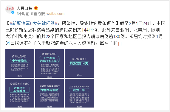 截至2月1日24时,中国已确诊新型冠状病毒感染的肺炎病例约14411例,此外来自亚洲、北美洲、欧洲、大洋洲和南美洲的共23个国家和地区已报告确诊病例逾130例。《纽约时报》1月31日报道罗列了关于新冠病毒的六大关键问题。戳图了解↓↓