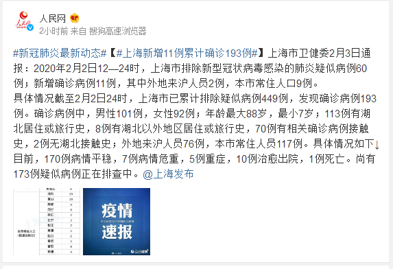 具体情况截至2月2日24时,上海市已累计排除疑似病例449例,发现确诊病例193例。确诊病例中,男性101例,女性92例;年龄最大88岁,最小7岁;113例有湖北居住或旅行史,8例有湖北以外地区居住或旅行史,70例有相关确诊病例接触史,2例无湖北接触史;外地来沪人员76例,本市常住人员117例。具体情况如下↓目前,170例病情平稳,7例病情危重,5例重症,10例治愈出院,1例死亡。尚有173例疑似病例正在排查中。