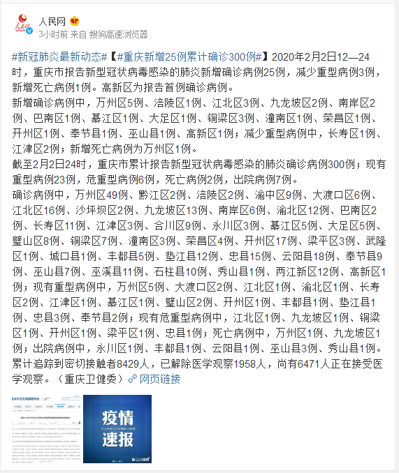 2020年2月2日12—24时,重庆市报告新型冠状病毒感染的肺炎新增确诊病例25例,减少重型病例3例,新增死亡病例1例。高新区为报告首例确诊病例。