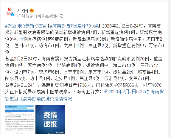 截至2月2日24时,追踪到密切接触者1736人,已解除医学观察666人,尚有1070人正在接受居家或集中医学观察。(海南卫健委)