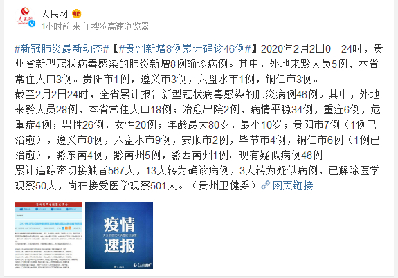截至2月2日24时,全省累计报告新型冠状病毒感染的肺炎病例46例。其中,外地来黔人员28例,本省常住人口18例;治愈出院2例,病情平稳34例,重症6例,危重症4例;男性26例,女性20例;年龄最大80岁,最小10岁;贵阳市7例(1例已治愈),遵义市8例,六盘水市9例,安顺市2例,毕节市4例,铜仁市6例(1例已治愈),黔东南4例,黔南州5例,黔西南州1例。现有疑似病例46例。