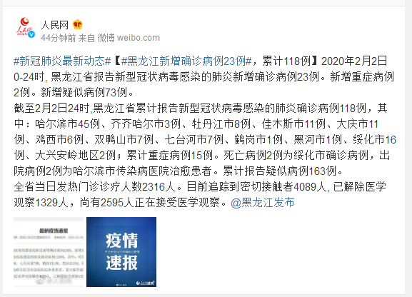 2020年2月2日0-24时, 黑龙江省报告新型冠状病毒感染的肺炎新增确诊病例23例。新增重症病例2例。新增疑似病例73例。