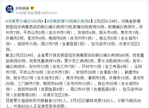 截至2月2日24时,全省累计报告新型冠状病毒感染的肺炎确诊病例566例,现有重症病例30例,现有危重病例14例,累计死亡病例2例,累计治愈病例14例。其中:确诊病例中,郑州市72例(含巩义市7例)、开封市11例(含兰考县4例)、洛阳市7例、平顶山市19例(含汝州市1例)、安阳市29例(含滑县1例)、鹤壁市8例、新乡市27例(含长垣市2例)、焦作市8例、濮阳市3例、许昌市15例、漯河市20例、三门峡市7例、南阳市84例(含邓州市15例)、商丘市50例(含永城市9例)、信阳市99例(含固始县9例)、周口市47例(含鹿邑县5例)、驻马店市58例(含新蔡县5例)、济源示范区2例。