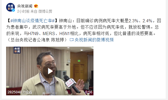 钟南山:目前确诊病例病死率大概是2.3%、2.4%,因为患者集中,武汉病死率要高于外地。但不应该因为病死率低,就放松警惕。总的来说,与H7N9、MERS、H5N1相比,病死率相对低,但比普通的流感要高。(总台央视记者公海泉 陈旭婷)