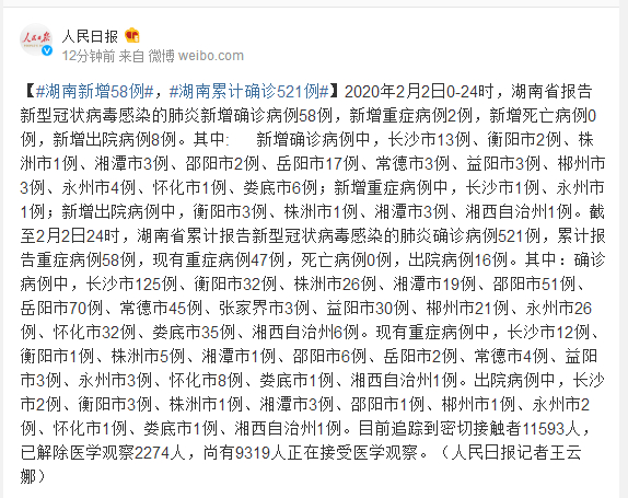 2020年2月2日0-24时,湖南省报告新型冠状病毒感染的肺炎新增确诊病例58例,新增重症病例2例,新增死亡病例0例,新增出院病例8例。其中: 新增确诊病例中,长沙市13例、衡阳市2例、株洲市1例、湘潭市3例、邵阳市2例、岳阳市17例、常德市3例、益阳市3例、郴州市3例、永州市4例、怀化市1例、娄底市6例;新增重症病例中,长沙市1例、永州市1例;新增出院病例中,衡阳市3例、株洲市1例、湘潭市3例、湘西自治州1例。截至2月2日24时,湖南省累计报告新型冠状病毒感染的肺炎确诊病例521例,累计报告重症病例58例,现有重症病例47例,死亡病例0例,出院病例16例。其中:确诊病例中,长沙市125例、衡阳市32例、株洲市26例、湘潭市19例、邵阳市51例、岳阳市70例、常德市45例、张家界市3例、益阳市30例、郴州市21例、永州市26例、怀化市32例、娄底市35例、湘西自治州6例。现有重症病例中,长沙市12例、衡阳市1例、株洲市5例、湘潭市1例、邵阳市6例、岳阳市2例、常德市4例、益阳市3例、永州市3例、怀化市8例、娄底市1例、湘西自治州1例。出院病例中,长沙市2例、衡阳市3例、株洲市1例、湘潭市3例、邵阳市1例、郴州市1例、永州市2例、怀化市1例、娄底市1例、湘西自治州1例。目前追踪到密切接触者11593人,已解除医学观察2274人,尚有9319人正在接受医学观察。(人民日报记者王云娜)