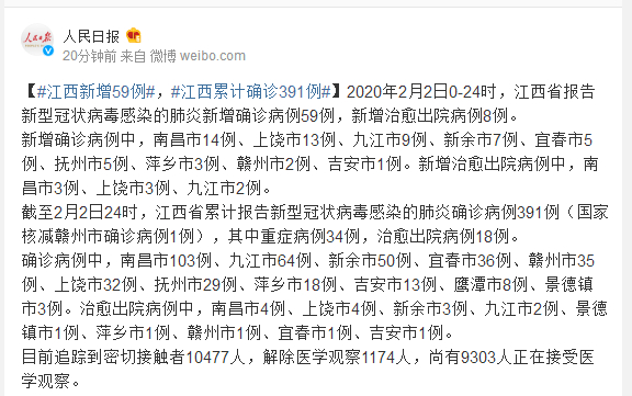 截至2月2日24时,江西省累计报告新型冠状病毒感染的肺炎确诊病例391例(国家核减赣州市确诊病例1例),其中重症病例34例,治愈出院病例18例。
