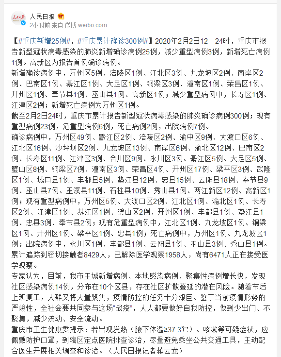 2020年2月2日12—24时,重庆市报告新型冠状病毒感染的肺炎新增确诊病例25例,减少重型病例3例,新增死亡病例1例。高新区为报告首例确诊病例。