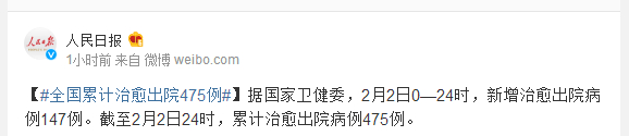 据国家卫健委,2月2日0—24时,新增治愈出院病例147例。截至2月2日24时,累计治愈出院病例475例。