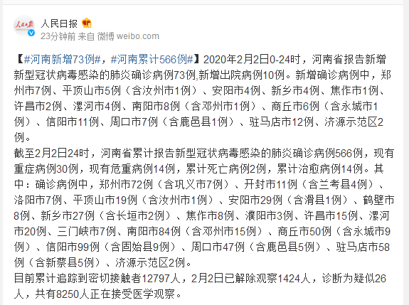 2020年2月2日0-24时,河南省报告新增新型冠状病毒感染的肺炎确诊病例73例,新增出院病例10例。新增确诊病例中,郑州市7例、平顶山市5例(含汝州市1例)、安阳市4例、新乡市4例、焦作市1例、许昌市2例、漯河市4例、南阳市8例(含邓州市1例)、商丘市6例(含永城市1例)、信阳市11例、周口市7例(含鹿邑县1例)、驻马店市12例、济源示范区2例。