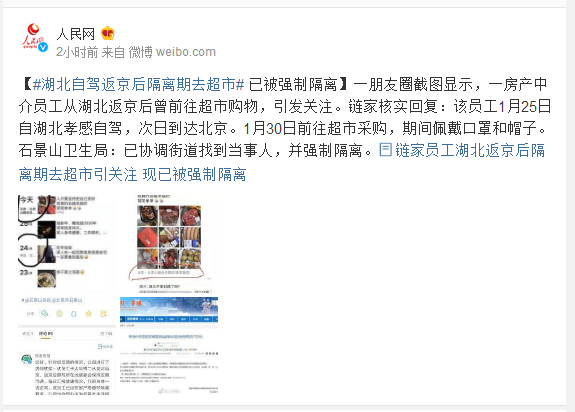 一朋友圈截图显示,一房产中介员工从湖北返京后曾前往超市购物,引发关注。链家核实回复:该员工1月25日自湖北孝感自驾,次日到达北京。1月30日前往超市采购,期间佩戴口罩和帽子。石景山卫生局:已协调街道找到当事人,并强制隔离。
