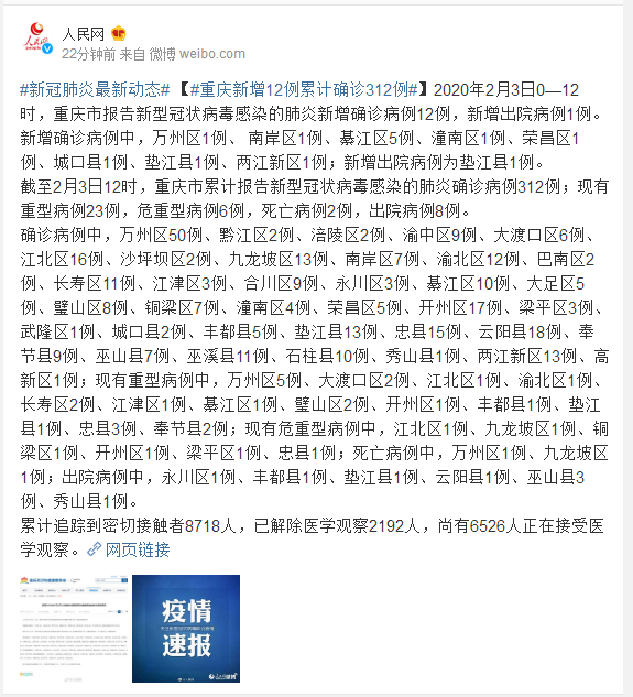 截至2月3日12时,重庆市累计报告新型冠状病毒感染的肺炎确诊病例312例;现有重型病例23例,危重型病例6例,死亡病例2例,出院病例8例。