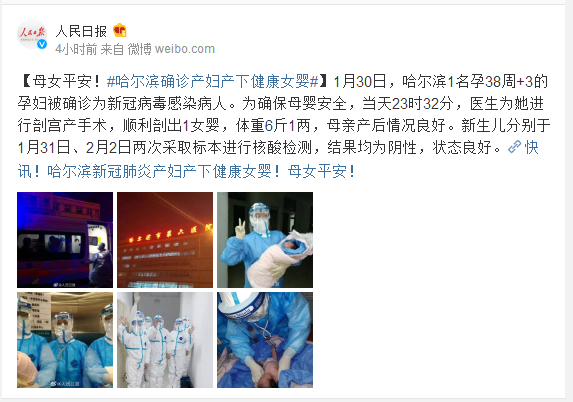 1月30日,哈尔滨1名孕38周+3的孕妇被确诊为新冠病毒感染病人。为确保母婴安全,当天23时32分,医生为她进行剖宫产手术,顺利剖出1女婴,体重6斤1两,母亲产后情况良好。新生儿分别于1月31日、2月2日两次采取标本进行核酸检测,结果均为阴性,状态良好。